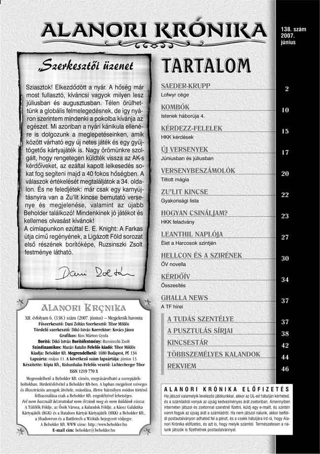 Alanori Krónika 138. (2007. június) - Tartalomjegyzék