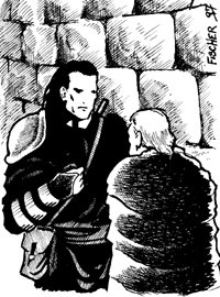 A férfi hátrált. A rázúduló mértani pontosságú csapások valamiféle különleges ritmusban követték egymást. Kivédhetetlenek voltak. Testén egyre szaporodtak a sebesülések. Fekete ruhája vértől lett mocskos. Vérvörös és éjsötét. Háta falnak ütközött, bár a térképet már elvesztette, biztos volt benne, hogy ez az a fal. Annak kell lennie! Fegyvertelen bal kezével hátranyúlt. Ujjai domborművű "téglát" tapintottak ki a megkopott falikárpit takarásában. Nyomógomb? Csak az lehet. Igen! A rejtekajtó gombja. Szinte ösztönösen nyomta volna befelé a követ, de az szilárdan állt a helyén. Erőt vett rajta a kétségbeesés. Magából kikelve, az őrökkel mit sem törődve kezdte rugdosni a falat.