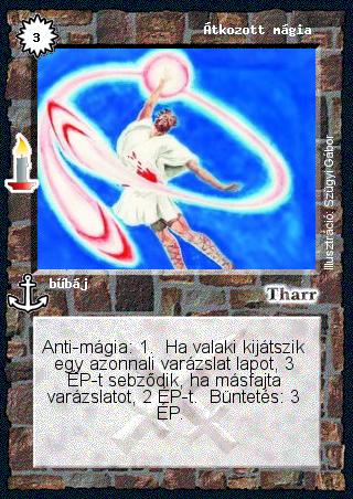 Kiadás: Múltidéző Gyakoriság: nem gyakori Lapszín (isten): Tharr Típus: bűbáj Szöveg: Anti-mágia: 1. Ha valaki kijátszik egy azonnali varázslat lapot, 3 ÉP-t sebződik, ha másfajta varázslatot, 2 ÉP-t. Büntetés: 3 ÉP. Illusztráció: