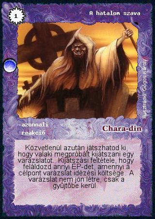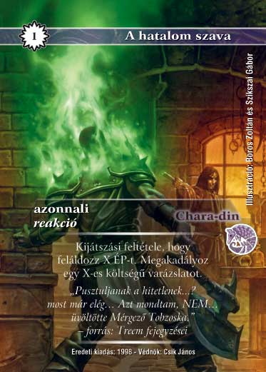 Kiadás: Árnyékhold, Alappakli, 8. kiadás, Védnök 2023, Túlélők Földje Gyakoriság: ritka Lapszín (isten): Chara-din Típus: azonnali Altípus: reakció Szöveg: Közvetlenül azután játszhatod ki, hogy valaki megpróbált kijátszani egy varázslatot. Kijátszási feltétele, hogy feláldozd annyi ÉP-det, amennyi a célpont varázslat idézési költsége. A varázslat nem jön létre, csak a gyűjtőbe kerül. Illusztráció: Gőgös Károly