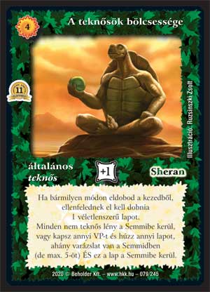 Kiadás: Védnök 2021, Alappakli, 11. kiadás Gyakoriság: ritka Lapszín (isten): Sheran Típus: általános Altípus: teknős Szöveg: Ha bármilyen módon eldobod a kezedből, ellenfelednek el kell dobnia 1 véletlenszerű lapot. Minden nem teknős lény a Semmibe kerül, vagy kapsz annyi VP-t és húzz annyi lapot, ahány varázslat van a Semmidben (de max. 5-öt) ÉS ez a lap a Semmibe kerül. Szinesítő szöveg: "Végig azt hittük, gyűlölik a mágiát. Pedig csak megóvni próbáltak bennünket tőle!" Illusztráció: Ruzsinszki Zsolt