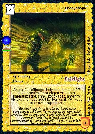 Kiadás: A föld síkja (Invázió) Gyakoriság: ritka Lapszín (isten): Fairlight Típus: építmény Altípus: bánya Szöveg: Az idézési költséget helyettesítheted 4 ÉP feláldozásával. Kör elején VP helyett kaphatsz szk-t, annyi szk-t kapsz, amennyi VP-t kapnál (egy adott körben csak VP-t vagy csak szk-t kaphatsz). Szinesítő szöveg: "Egyesek szerint a törpék az ősidőkben egyezséget kötöttek Ferwagorral, az elementál lorddal. Sokan még ma is találgatják, mit fizettek cserébe hihetetlen tehetségükért és szerencséjükért, amellyel mithrilre és más értékes fémekre bukkannak." Illusztráció: Tervező: Mittó Ferenc