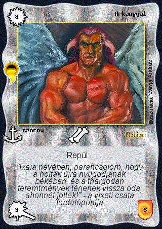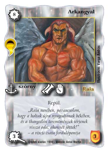 Kiadás: Aranyforrás, Védnök 2023, Túlélők Földje Gyakoriság: ritka Lapszín (isten): Raia Típus: szörny Szöveg: Repül. Szinesítő szöveg: "Raia nevében, parancsolom, hogy a holtak újra nyugodjanak békében, és a thargodan teremtmények térjenek vissza oda, ahonnét jöttek!" - a vixeti csata fordulópontja Illusztráció: Varga András