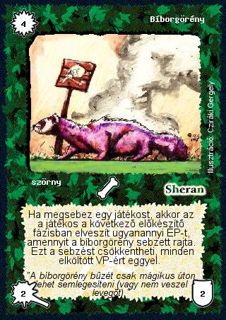 Kiadás: Alappakli, 2. kiadás, Alappakli, 3. kiadás, Alappakli, 4. kiadás, Hőskorszak Gyakoriság: nem gyakori Lapszín (isten): Sheran Típus: szörny Szöveg: Ha megsebez egy játékost, akkor az a játékos a következő előkészítő fázisban elveszít ugyanannyi ÉP-t, amennyit a bíborgörény sebzett rajta. Ezt a sebzést csökkentheti, minden elköltött VP-ért eggyel. Szinesítő szöveg: "A bíborgörény bűzét csak mágikus úton lehet semlegesíteni (vagy nem veszel levegőt)." Illusztráció: Cziráki Gergely