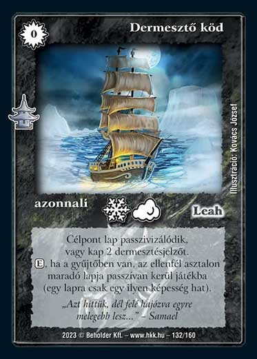 Kiadás: Császárváros Gyakoriság: nem gyakori Lapszín (isten): Leah Típus: azonnali Szöveg: Célpont lap passzivizálódik, vagy kap 2 dermesztésjelzőt. (E), ha a gyűjtőben van, az ellenfél asztalon maradó lapja passzívan kerül játékba (egy lapra csak egy ilyen képesség hat). Szinesítő szöveg: "Azt hittük, dél felé hajózva egyre melegebb lesz..." - Samael Illusztráció: Kovács József