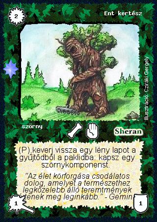Kiadás: Ezüsthajnal Gyakoriság: gyakori Lapszín (isten): Sheran Típus: szörny Szöveg: (P),keverj vissza egy lény lapot a gyűjtődből a paklidba: kapsz egy szörnykomponenst. Szinesítő szöveg: "Az élet körforgása csodálatos dolog, amelyet a természethez legközelebb álló teremtmények értenek meg leginkább." - Gemina Illusztráció: Cziráki Gergely