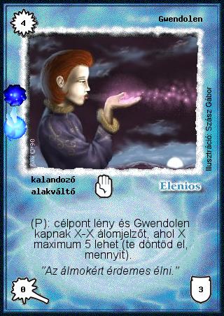 Kiadás: Álomvilág (Invázió) Gyakoriság: ritka Lapszín (isten): Elenios Típus: kalandozó Altípus: alakváltó Szöveg: (P): célpont lény és Gwendolen kapnak X-X álomjelzőt, ahol X maximum 5 lehet (te döntöd el, mennyit). Szinesítő szöveg: "Az álmokért érdemes élni." Illusztráció: Szász Gábor
