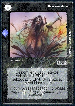 Kiadás: Ezüsthajnal, Túlélők Földje Gyakoriság: ritka Lapszín (isten): Leah Típus: azonnali Szöveg: Célpont lény vagy játékos sebződik 4 ÉP-t, és te is sebződsz 3 ÉP-t. A varázslat nem hat Haarkonra. Szinesítő szöveg: "A düh rossz tanácsadó! - próbálta Augur Haarkon visszatartani, de elkésett." Illusztráció: Gőgös Károly