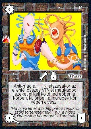Kiadás: Ősi legendák Gyakoriság: ritka Lapszín (isten): Tharr Típus: szörny Altípus: moa Szöveg: Anti-mágia: 1. Kijátszásakor az ellenfél összes VP-jét megkapod, ezeket el kell költened ebben a körben, különben a maradék kör végén elvész. Szinesítő szöveg: "Ha hinni lehet a hideg precizitásukról szóló történeteknek... hu, a hideg futkározik a hátamon!" - Tomkala Illusztráció: