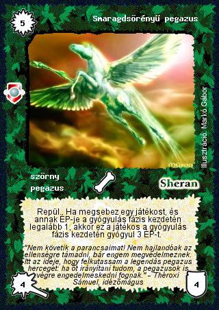 Kiadás: Víziók Gyakoriság: nem gyakori Lapszín (isten): Sheran Típus: szörny Altípus: pegazus Szöveg: Repül. Ha megsebez egy játékost, és annak ÉP-je a gyógyulás fázis kezdetén legalább 1, akkor ez a játékos a gyógyulás fázis kezdetén gyógyul 3 ÉP-t. Szinesítő szöveg: "Nem követik a parancsaimat! Nem hajlandóak az ellenségre támadni, bár engem megvédelmeznek. Itt az ideje, hogy felkutassam a legendás pegazus herceget: ha őt irányítani tudom, a pegazusok is végre engedelmeskedni fognak." - Théroxi Sámuel, idézőmágus Illusztráció: Markó Gábor