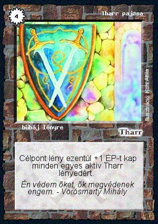 Kiadás: Alappakli, 1. kiadás, Alappakli, 2. kiadás, Alappakli, 3. kiadás, Alappakli, 4. kiadás Gyakoriság: nem gyakori Lapszín (isten): Tharr Típus: bűbáj lényre Szöveg: Célpont lény ezentúl +1 ÉP-t kap minden egyes aktív Tharr lényedért. Szinesítő szöveg: Én védem őket, ők megvédenek engem. - Vörösmarty Mihály Illusztráció: Kohl Attila